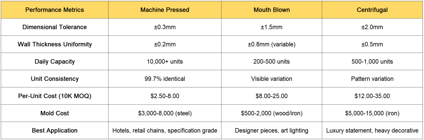 Machine pressing utilizes H13 tool steel molds (Rockwell hardness 48-52 HRC) with automated glass gob weight control (±2%), pressing force 0.5-2.5MPa, and precision timing (15-45 second cycle) to achieve injection-molding-level repeatability in glass.